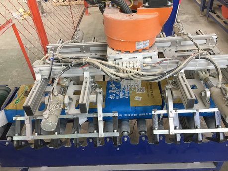 將產品通過進料輸送帶輸送進料,機器人及夾具到產品上方,抓取產品后移動到棧板位,按事先輸入的碼垛形式進行產品碼放,碼放完成后自動輸送到纏繞工位,纏繞完成后叉車運走。