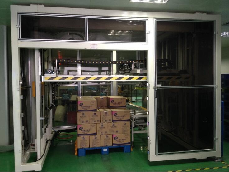 將產品通過進料輸送帶輸送進料,升降機移載著機械手夾具到產品上方,升降機構下降抓取產品后平穩(wěn)上升,水平移動到棧板位,按事先輸入的碼垛形式進行產品碼放。碼垛裝置是依靠伺服電機和鏈條傳動來同步運行控制,確保產品碼放位置淮確。