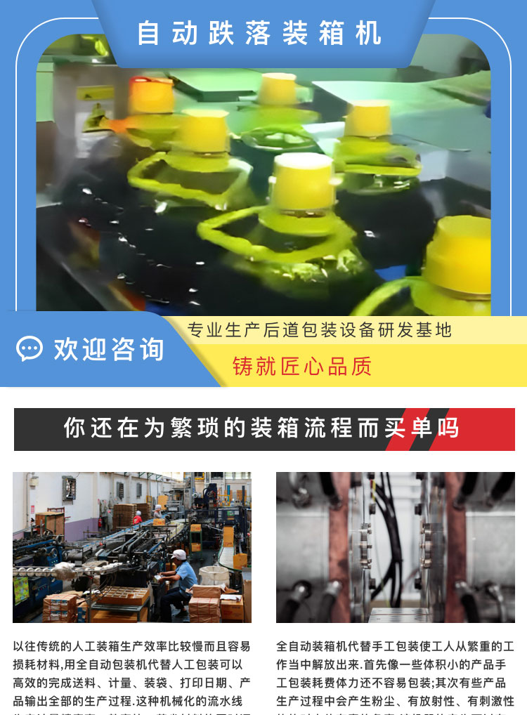 介紹:自動跌落裝箱機。專業生產后道包裝設備研發基地鑄就匠心品質。你還在為繁瑣的裝箱流程而買單嗎?以往傳統的人工裝箱生產效率比較慢而且容易損耗材料,用全自動包裝機代替人工包裝可以的完成送料、計量、裝袋、打印日期、產品輸出全部的生產過程。這種機械化的流水線生產計量精度高、效率快、節省材料的同時還減少了人工成本。 全自動裝箱機代替手工包裝使工人從繁重的工作當中解放出來。像一些體積小的產品手工包裝耗費體力還不容易包裝;其次有些產品生產過程中會產生粉塵、有放射性、有刺激性的的對人體有毒的危害。該機器的產生可以的解決這些問題。 產品別稱:裝箱機、裝盒機、自動裝箱機、自動裝盒機、跌落式裝箱機、側推式裝箱機、抓舉式裝箱機、機器人裝箱機、一片式裹包機、食用油跌落式裝箱機。